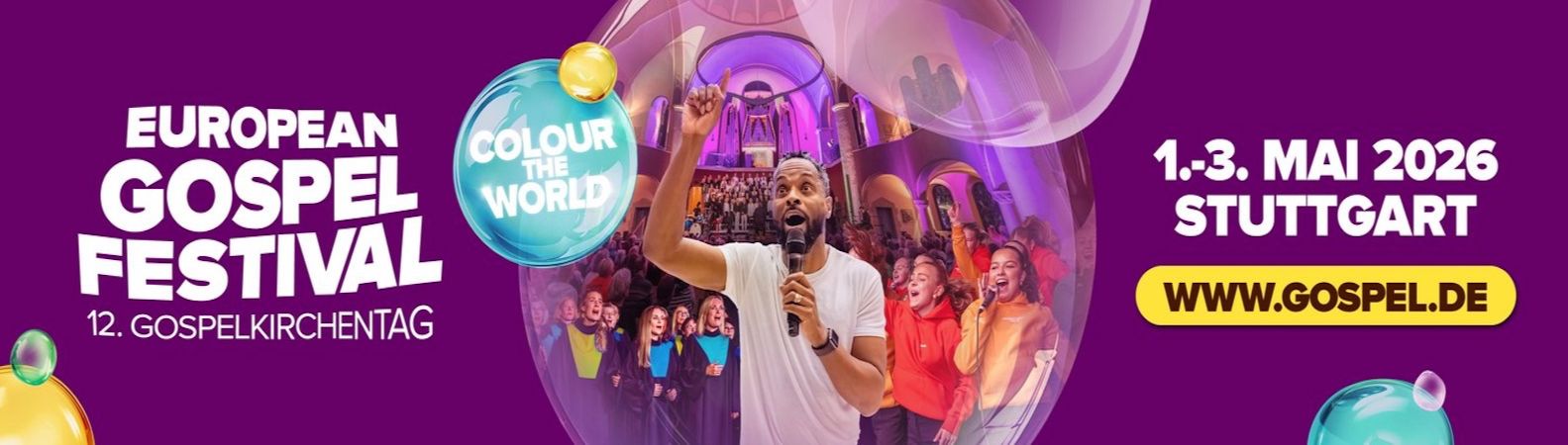 Rund 5.000 Sängerinnen und Sänger aus ganz Europa werden vom 1. bis 3. Mai 2026 in Stuttgart unter dem Motto „Colour the World“ zum 12. Gospelkirchentag / das European Gospel Festival erwartet. Zum Festival gehört auch die Musikmeile: an zahlreichen Auftrittsplätzen in der Fußgängerzone oder an anderen Einkaufs-/Shopping-Bereichen der Innenstadt zeigen am Samstag von 11:00 bis 19:00 Musikerinnen und Musiker ihr Können.