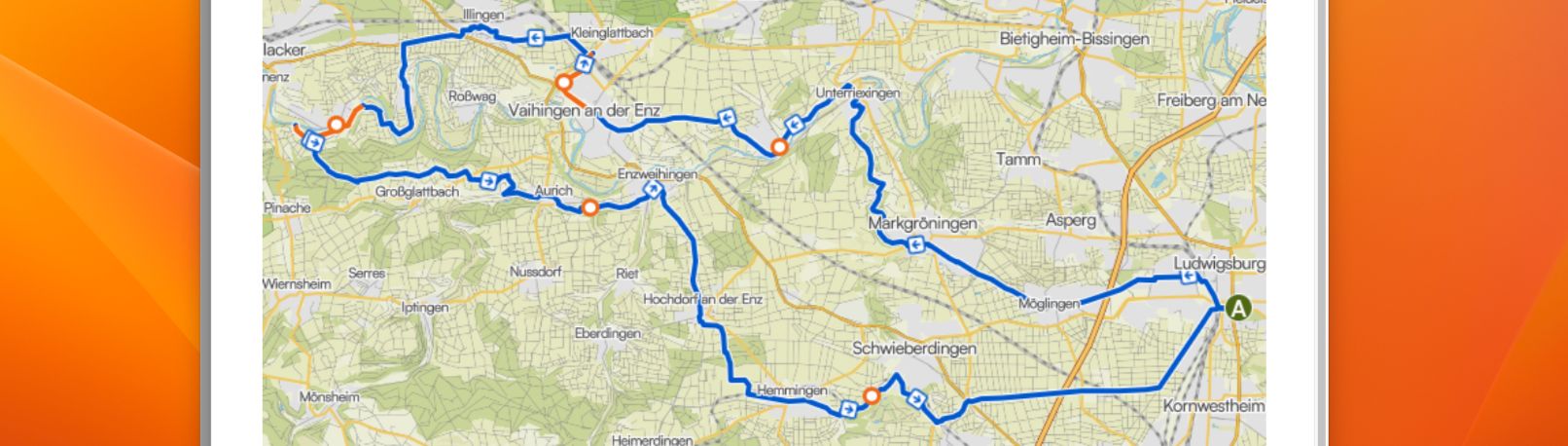 Start am Salonwald in LB, weiter nach Markgröningen, Glemstal, Oberriexingen, Kleinglattbach, Lomersheim, Großglattbach, Hemmingen und zurück nach LB (ca. 80 km)